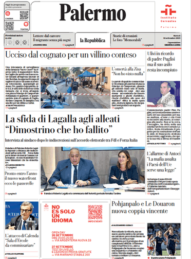 Prime pagine Prima pagina Repubblica Palermo: “Ucciso dal cognato per un villino conteso” Segui Ilovepalermocalcio su Google News Redazione Ilovepalermocalcio Settembre 16, 2025 La sfida di Lagalla agli alleati “Dimostrino che ho fallito” Continue Reading Previous Prima pagina Repubblica Palermo: “Comune, le spine di Lagalla. In salita la strada per il bis”Next Prima pagina Corriere dello Sport: “Un altro Kenan”