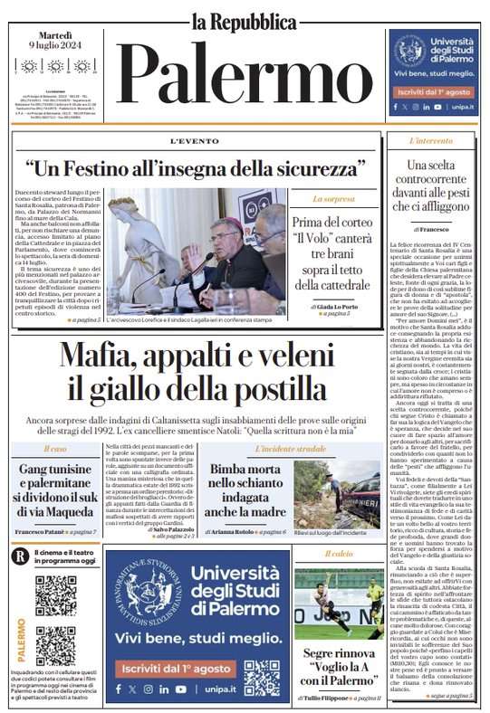 Prima pagina Repubblica Palermo: “Un festino all’insegna della sicurezza”