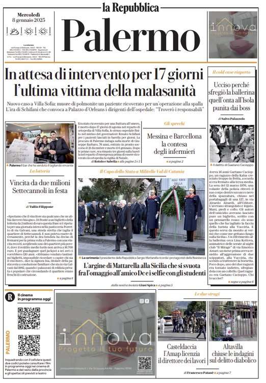 Prima pagina Repubblica Palermo: “Vincita da due milioni. Settecannoli in festa”
