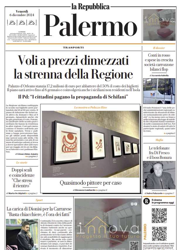 Prima pagina Repubblica Palermo: “Voli a prezzi dimezzati, la strenna della Regione”