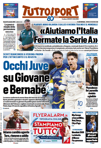 Prime pagine Prima pagina Tuttosport: “«Aiutiamo l’Italia Fermate la Serie A»” Segui Ilovepalermocalcio su Google News Redazione Ilovepalermocalcio Novembre 21, 2025 Plusvalenze: De Laurentiis rinviato a giudizio Continue Reading Previous Prima pagina Corriere dello Sport: “Bani c’è”Next Prima pagina Giornale di Sicilia: “Aliscafi, accuse e maxi sequestro”