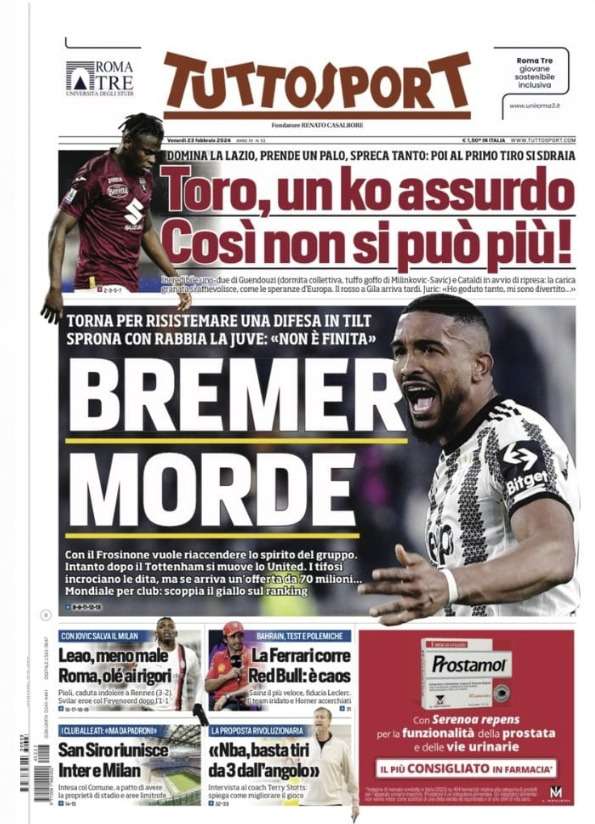 L’edizione odierna di Tuttosport dedica la prima pagina alla Juve e a Bremer.