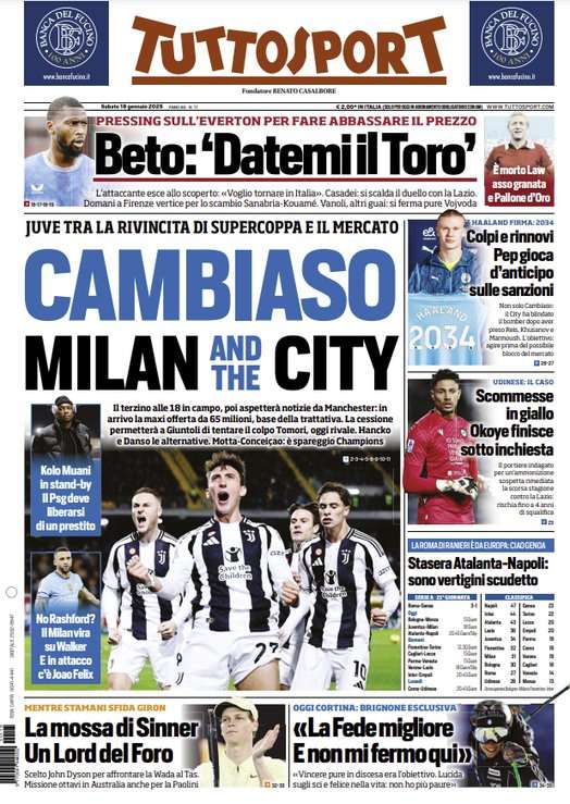 Prime pagine Prima pagina Tuttosport: “Cambiaso, Milan and the City” Segui Ilovepalermocalcio su Google News Redazione Ilovepalermocalcio Gennaio 18, 2025 L’edizione odierna di Tuttosport dedica un titolo in prima pagina al futuro di Cambiaso. Continue Reading Previous Prima pagina Gazzetta dello Sport: “Milan, Walker c’è”Next Prima pagina Repubblica Palermo: “Allagamenti, voli dirottati e crolli””