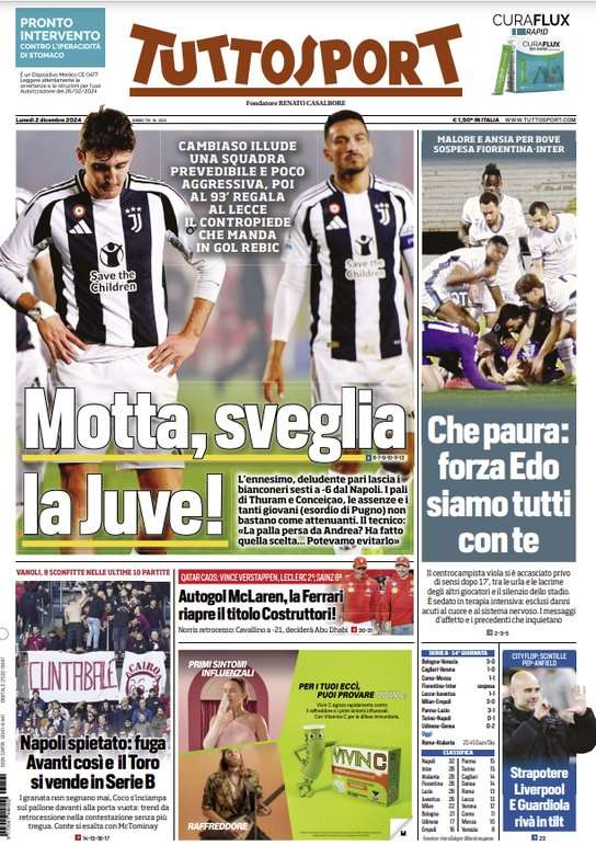 Prima pagina Tuttosport: “Che paura, forza Edo siamo tutti con te”