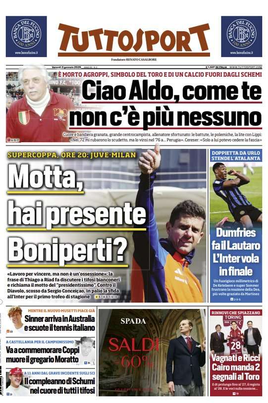 Prima pagina Tuttosport: “Ciao Aldo, come te non c’è più nessuno”