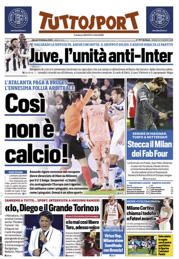 L’edizione odierna di Tuttosport dedica un titolo in prima pagina alla gara dell’Atalanta e l’ennesima follia arbitrale.