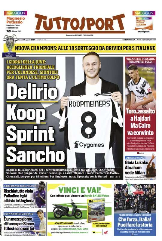 Prime pagine Prima pagina Tuttosport: “Delirio Koop, sprint Sancho” Segui Ilovepalermocalcio su Google News Redazione Ilovepalermocalcio Agosto 29, 2024 L’edizione odierna di Tuttosport dedica un titolo in prima pagina al mercato della Juventus. Continue Reading Previous Prima pagina Gazzetta dello Sport: “Diavolo Abraham”Next Prima pagina Repubblica Palermo: “Indagati altri due marinai del Bayesian”