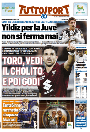 Prima pagina Tuttosport: “Fanta Sinner. Racchetta d’oro. Strapazza Alcaraz”