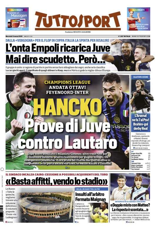 Prima pagina Tuttosport: “Hancko prove di Juve contro Lautaro”