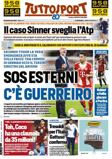 Prime pagine Prima pagina Tuttosport: “Il caso Sinner sveglia l’Atp” Segui Ilovepalermocalcio su Google News Redazione Ilovepalermocalcio Ottobre 8, 2025 Tresoldi per l’Italia Gattuso conferma Continue Reading Previous Prima pagina Repubblica Palermo: “Mondello, l’ombra del clan. Genova lascia l’Italo Belga”Next Prima pagina Repubblica Palermo: Decreto Caivano, primi lavori I presidi: “Salvate le scuole”