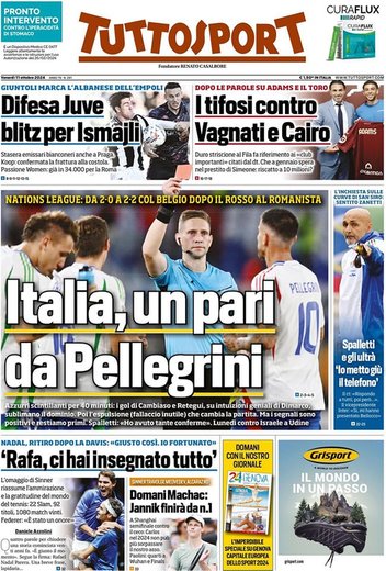 Prime pagine Prima pagina Tuttosport: “Italia, un pari da Pellegrini” Segui Ilovepalermocalcio su Google News Redazione Ilovepalermocalcio Ottobre 11, 2024 L’edizione odierna di Tuttosport dedica un titolo in prima pagina al pareggio dell’Italia contro il Belgio. Continue Reading Previous Prima pagina Gazzetta dello Sport: “Il rosso frena l’Italia”Next Prima pagina Repubblica Palermo: “Autisti a casa e bus in garage, il percorso tormentato dell’Amat”