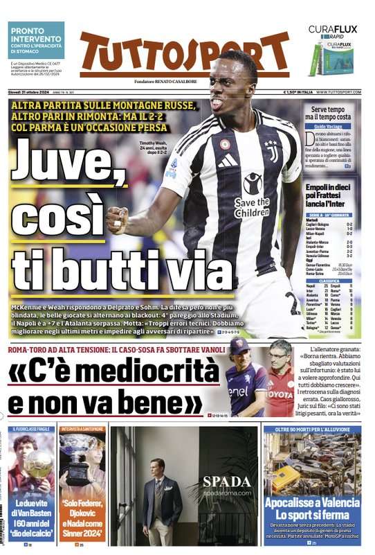 L’edizione odierna di Tuttosport dedica un titolo in prima pagina alla Juventus che ha pareggiato in casa contro il Parma.