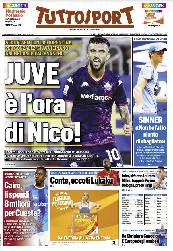 Prime pagine Prima pagina Tuttosport: “Juve, è l’ora di Nico” Segui Ilovepalermocalcio su Google News Redazione Ilovepalermocalcio Agosto 24, 2024 L’edizione odierna di Tuttosport dedica un titolo in prima pagina al mercato della Juve. Continue Reading Previous Prima pagina Gazzetta dello Sport: “L’Inter cambia la coppia”Next Prima pagina Repubblica Palermo: “Il ritorno a casa di Sirigu”