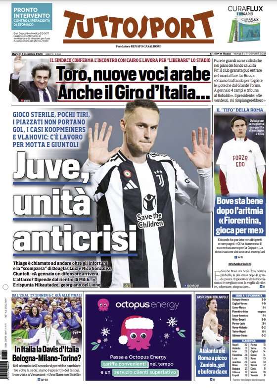 Prime pagine Prima pagina Tuttosport: “Juve, unità anticrisi” Segui Ilovepalermocalcio su Google News Redazione Ilovepalermocalcio Dicembre 3, 2024 L’edizione odierna di Tuttosport dedica un titolo in prima pagina alla Juventus. Continue Reading Previous Prima pagina Gazzetta dello Sport: “Sogno Dea, Atalanta da scudetto”Next Prima pagina Repubblica Palermo: “Emergenza idrica, fragile tregua sull’Ancipa”