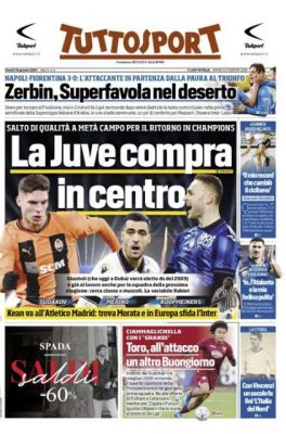 Archivio News Prime pagine SERIE A Prima pagina Tuttosport: “La Juve compra in centro” Segui Ilovepalermocalcio su Google News Redazione Ilovepalermocalcio Gennaio 19, 2024 L’edizione odierna di Tuttosport dedica la prima pagina alla Juventus. Tags: juventus Continue Reading Previous Prima pagina Gazzetta dello Sport: “Fame Inter”Next Corriere dello Sport: “Bologna, continua la sfida di mercato con il Palermo per Amian”