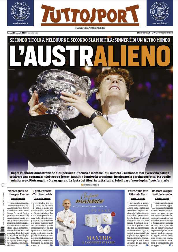 Prime pagine Prima pagina Tuttosport: “L’Australieno” Segui Ilovepalermocalcio su Google News Redazione Ilovepalermocalcio Gennaio 27, 2025 L’edizione odierna di Tuttosport dedica un titolo in prima pagina a Sinner. Continue Reading Previous Prima pagina Gazzetta dello Sport: “Marziano”Next Prima pagina Giornale di Sicilia: “Regione, stretta sulle pensioni”
