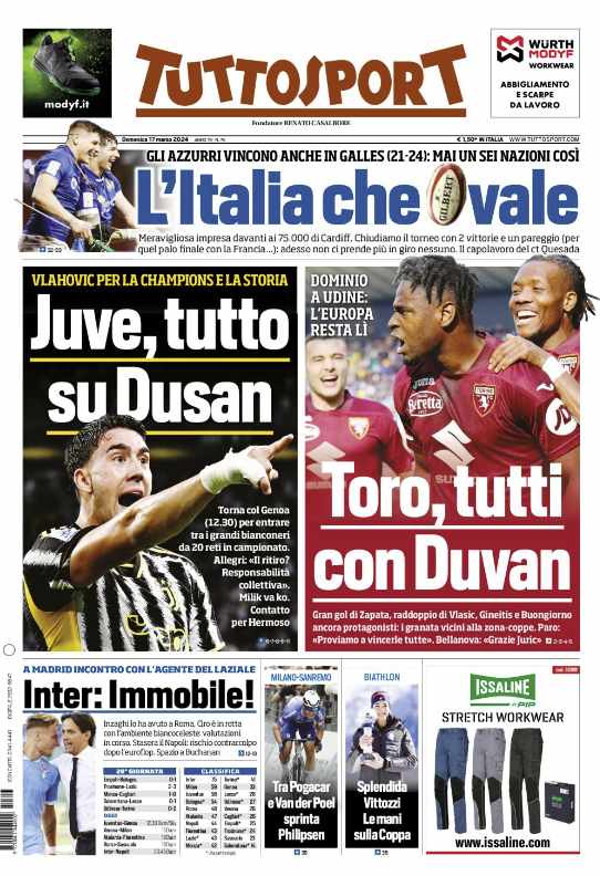 Prime pagine Prima pagina Tuttosport: “L’Italia che vale” Segui Ilovepalermocalcio su Google News Redazione Ilovepalermocalcio Marzo 17, 2024 L’edizione odierna di Tuttosport dedica la prima pagina all’Italia. Continue Reading Previous Prima pagina Gazzetta dello Sport: “Giroud lascia, Vlahovic raddoppia”Next Prima pagina Repubblica: “Due falsi atenei, un filo comune. Il doppio binario dell’imbroglio”
