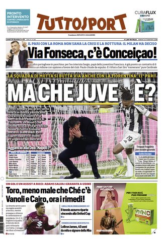 Prime pagine Prima pagina Tuttosport: “Ma che Juve è?” Segui Ilovepalermocalcio su Google News Redazione Ilovepalermocalcio Dicembre 30, 2024 L’edizione odierna di Tuttosport dedica un titolo in prima pagina alla Juventus. Continue Reading Previous Prima pagina Gazzetta dello Sport: “Fonseca è finita”Next Prima pagina Gazzetta dello Sport: “Belle d’Arabia”