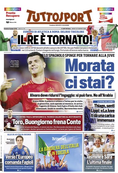 Prime pagine Prima pagina Tuttosport: “Morata ci stai?” Segui Ilovepalermocalcio su Google News Redazione Ilovepalermocalcio Giugno 9, 2024 L’edizione odierna di “Tuttosport” si sofferma in prima pagina sulla Juve e Morata. Continue Reading Previous Prima pagina Gazzetta dello Sport: “Ori d’Italia”Next Prima pagina Repubblica Palermo: “Toh, chi si rivede. Migliaccio nello staff rosanero”