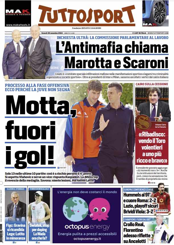 Prime pagine Prima pagina Tuttosport: “Motta, fuori i gol” Segui Ilovepalermocalcio su Google News Redazione Ilovepalermocalcio Novembre 29, 2024 L’edizione odierna di Tuttosport dedica un titolo in prima pagina alla Juventus. Continue Reading Previous Prima pagina Gazzetta dello Sport: “Scudetto in tre mesi”Next Prima pagina Repubblica Palermo: “A Catania il derby dei fondi per il Capodanno. Antonacci in pole per il veglione di Palermo”