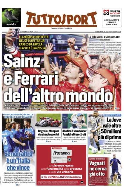 Prime pagine Prima pagina Tuttosport: “Sainz e Ferrari dell’altro mondo” Segui Ilovepalermocalcio su Google News Redazione Ilovepalermocalcio Marzo 25, 2024 L’edizione odierna di Tuttosport dedica la prima pagina alla Ferrari e la doppietta in Australia. Continue Reading Previous Prima pagina Gazzetta dello Sport: “Magia Rossa”Next Prima pagina Giornale di Sicilia: “Missili ipersonici, allerta Nato”