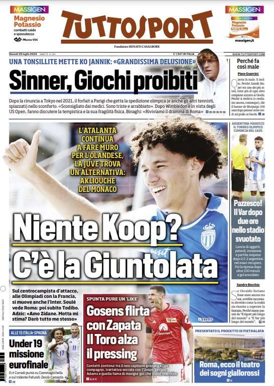 Prime pagine Prima pagina Tuttosport: “Sinner, giochi proibiti” Segui Ilovepalermocalcio su Google News Redazione Ilovepalermocalcio Luglio 25, 2024 L’edizione odierna di Tuttosport dedica un titolo in prima pagina al forfait di Sinner. Continue Reading Previous Prima pagina Gazzetta dello Sport: “Juve di lusso”Next Prima pagina Repubblica Palermo: “La grande sete”