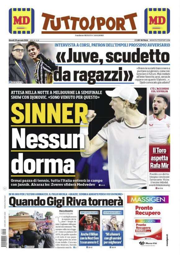 L’edizione odierna di Tuttosport si sofferma in prima pagina su Sinner.