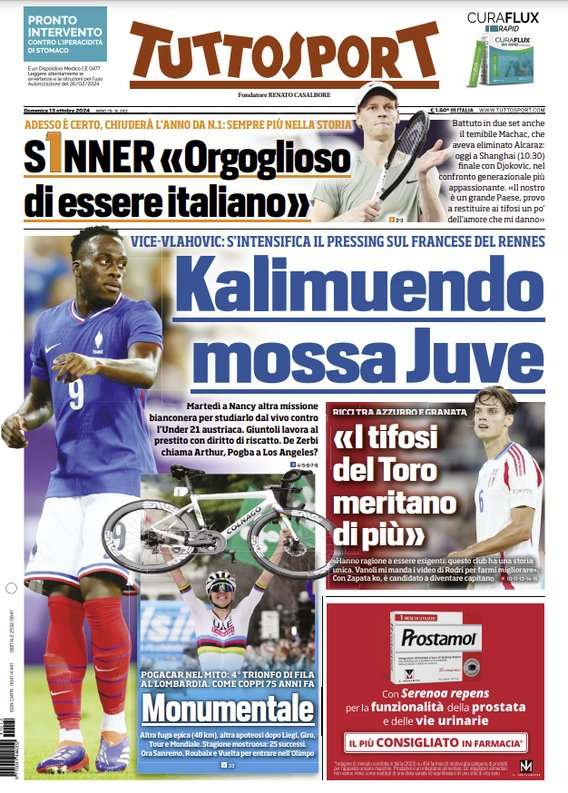 L’edizione odierna di Tuttosport dedica un titolo in prima pagina a Sinner.