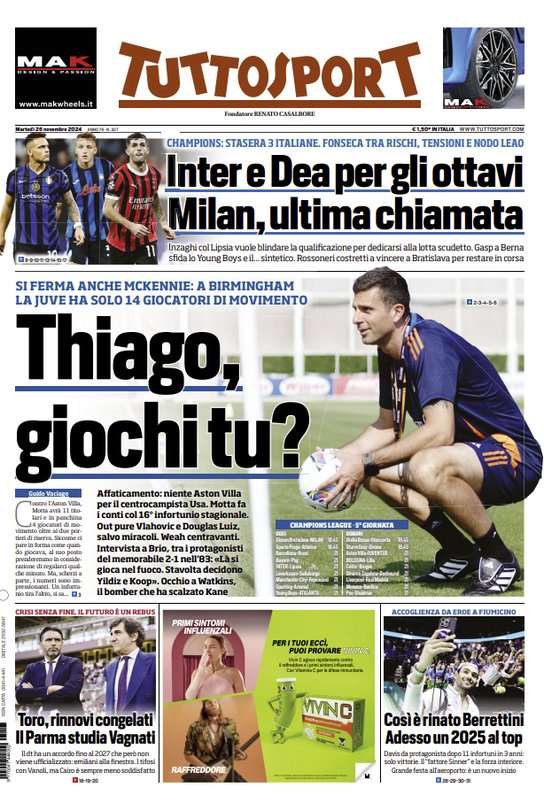 Prime pagine Prima pagina Tuttosport: “Thiago, giochi tu?” Segui Ilovepalermocalcio su Google News Redazione Ilovepalermocalcio Novembre 26, 2024 L’edizione odierna di Tuttosport dedica un titolo in prima pagina alla Juventus. Continue Reading Previous Prima pagina Gazzetta dello Sport: “Inter vai alle stelle”Next Prima pagina Repubblica Palermo: “Per i rosa festival dei rimpianti, quei fischi che Dionisi non sente”