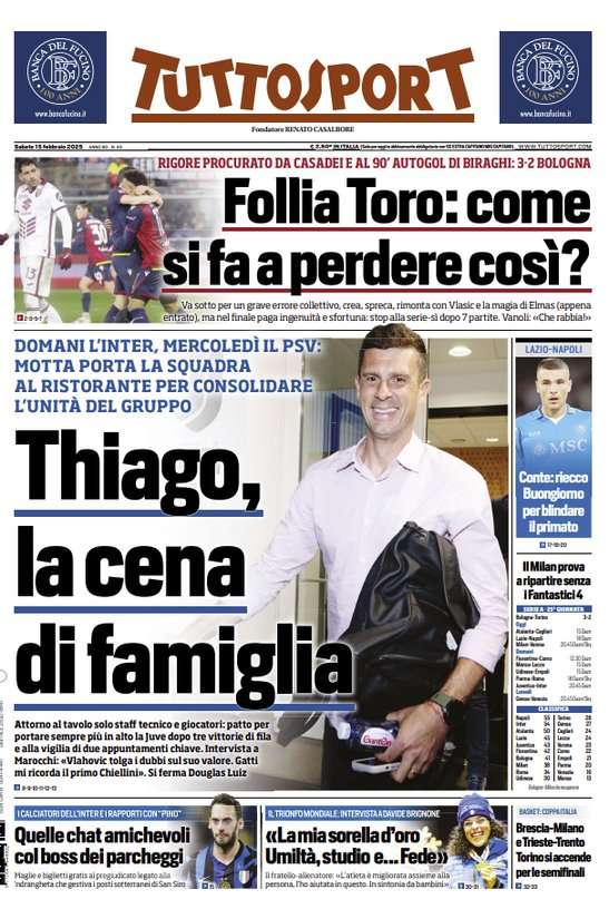 Prime pagine Prima pagina Tuttosport: “Thiago, la cena di famiglia” Segui Ilovepalermocalcio su Google News Redazione Ilovepalermocalcio Febbraio 15, 2025 L’edizione odierna di Tuttosport dedica un titolo in prima pagina alla Juventus. Continue Reading Previous Prima pagina Repubblica Palermo: “Un tasto di allarme per gli autisti del bus”Next Prima pagina Repubblica Palermo: “Cambiano i burocrati regionali”