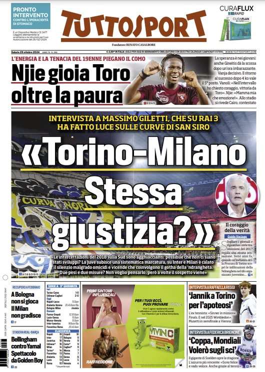 L’edizione odierna di Tuttosport dedica un titolo in prima pagina al pensiero di Massimo Giletti sulle indagini che riguardano gli ultras di San Siro.