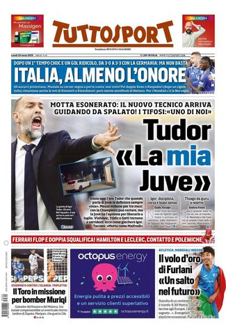 Prime pagine Prima pagina Tuttosport: “Tudor, la mia Juve” Segui Ilovepalermocalcio su Google News Redazione Ilovepalermocalcio Marzo 24, 2025 L’edizione odierna di Tuttosport dedica un titolo in prima pagina alla Juventus. Continue Reading Previous Prima pagina Gazzetta dello Sport: “Italia, che rabbia”Next Prima pagina Corriere dello Sport: “Palermo, Segre si candida per Salerno”