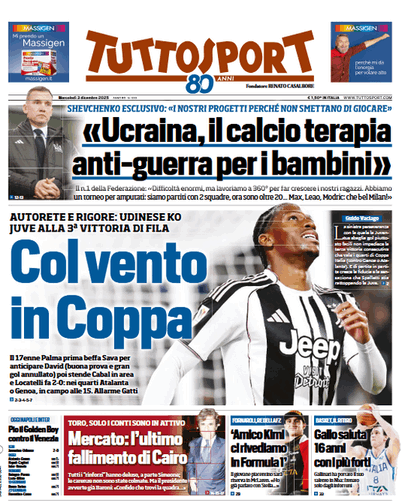 Prime pagine Prima pagina Tuttosport: “«Ucraina, il calcio terapia anti-guerra per i bambini»” Segui Ilovepalermocalcio su Google News Redazione Ilovepalermocalcio Dicembre 3, 2025 Mercato: l’ultimo fallimento di Cairo Continue Reading Previous Prima pagina Giornale di Sicilia: “Gli alleati si stringono a Schifani”Next Prima pagina Gazzetta dello Sport: “«Tennis, calcio e amici attori Nick era unico»”