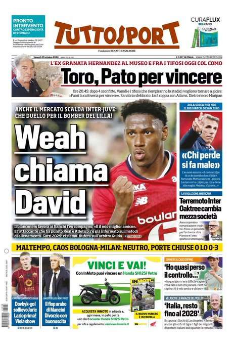 Prime pagine Prima pagina Tuttosport: “Weah chiama David” Segui Ilovepalermocalcio su Google News Redazione Ilovepalermocalcio Ottobre 25, 2024 L’edizione odierna di Tuttosport dedica un titolo in prima pagina al mercato di Juve e Inter. Continue Reading Previous Prima pagina Gazzetta dello Sport: “Ibra confessa il Milan””Next Prima pagina Repubblica Palermo: “Traffico e smog, il fiasco della Ztl”