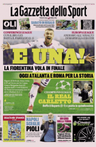 L'edizione odierna de "La Gazzetta dello Sport" dedica la prima pagina alla Fiorentina in finale di Europa League.