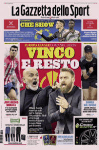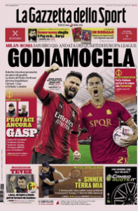 L'edizione odierna de "La Gazzetta dello Sport" dedica la prima pagina al derby in Europa League tra Milan e Roma.