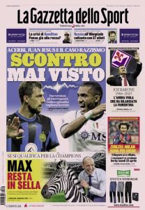 L'edizione odierna de "La Gazzetta dello Sport" si sofferma in prima pagina sul caso razzismo che coinvolge Acerbi.