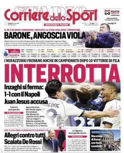 L'edizione odierna de "Il Corriere dello Sport" dedica la prima pagina sul pari tra Inter e Napoli.