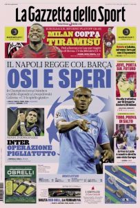 L'edizione odierna de "La Gazzetta dello Sport" dedica la prima pagina al pareggio del Napoli contro il Barcellona.