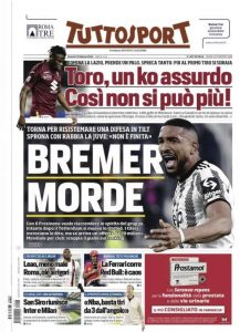 L'edizione odierna di Tuttosport dedica la prima pagina alla Juve e a Bremer.