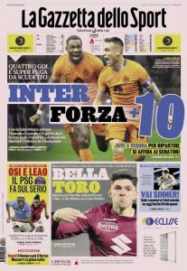 L'edizione odierna de "La Gazzetta dello Sport" dedica la prima pagina all'Inter che ha vinto contro la Salernitana.
