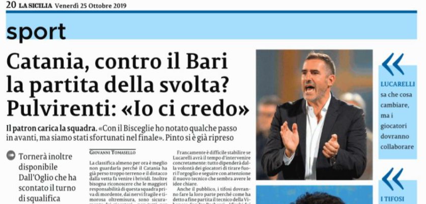 «Contro il Bari la partita della svolta, io ci credo. Con il Bisceglie ho visto qualche miglioramento, siamo stati sfortunati nel finale». Queste le parole di Nino Pulvirenti, presidente del Catania, rilasciate ai microfoni di “La Sicilia”.