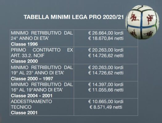 L’AIC infatti riporta uno schema riassuntivo delle cifre minime garantite ai giocatori della Lega Pro, con i minimi retribuitivi che i calciatori potranno guadagnare nel corso della stagione 2020/21, ovverosia l’annata in corso.