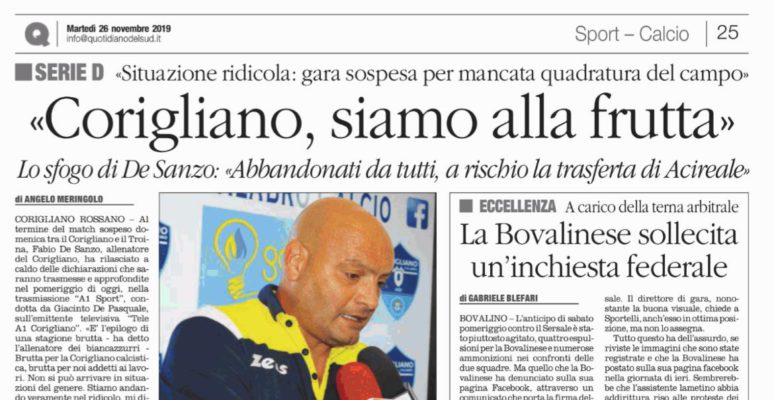 Quotidiano del Sud: “«Corigliano, siamo alla frutta». Lo sfogo di De Sanzo: «Abbandonati da tutti, a rischio la trasferta di Acireale»”