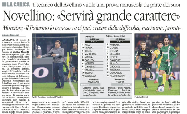 “E’ tempo di tornare a vincere. L’Avellino avrà la possibilità di monetizzare al massimo il doppio turno casalingo. La truppa di Walter Novellino domani pomeriggio, alle ore 15, affronterà il Palermo. Una delle candidate alla promozione diretta in massima serie. E’ un Palermo a tratti più nero che rosa. La sconfitta interna contro il Cittadella condita dalle vicende societarie con una istanza di fallimento presentata dalla Procura di Palermo. Nonostante ciò, l’Avellino, non dovrà prendere sotto gamba l’impegno contro i sicliani. «E’ una partita importante per entrambe. Conosciamo l’importanza di questa gara. Affronteremo una squadra costruita per vincere il campionato. Spero che i miei ragazzi si facciano trovare pronti. Spero forniremo una prova di carattere, senza questo nonsi ottiene niente. Dobbiamo giocare con cattiveria agonistica. Scenderemo in campo per vincere, non voglio chiacchiere». Il tecnico biancoverde parla del rapporto con Maurizio Zamparini: «Lui è una persona buona e spontanea – spiega il tecnico dei lupi – Lo rispetto molto. Abbiamo vissuto due anni e tre mesi insieme. Con lui avevo sempre la valigia pronta, però mi ha sempre apprezzato. A Venezia abbiamo raggiunto obiettivi importanti, avevo sempre la valigia pronta». Il trainer dei biancoverdi ripercorre anche il ko del Palermo contro il Cittadella dello scorso turno di campionato: «E’ una signora squadra, probabile che la squadra abbia risentito di qualche tensione esterna. Detto questo i giocatori del Palermo sono professionisti e scenderanno in campo per vincere. Avrà ancora più rabbia in corpo, vorrei che noi non fossimo da meno». Il tecnico parla anche su come bisogna affrontare i rosanero: «Sicuramente domani dovremo chiudere le loro giocate e ripartire. Vorrei tanto che i miei giocatori capissero i momenti dove si possono vincere le partite. Il Palermo lo conosco e ci può creare delle difficoltà, ma anche noi abbiamo una struttura importante. Anche a Frosinone c’è stato un momento per vincerla. E in questi casi serve l’esperienza». «Non ci sarà Di Tacchio, ma allo stesso tempo abbiamo Moretti che può dire la sua – spiega – Avrà l’occasione di giocare nel suo ruolo. Dobbiamo sopperire a questa assenza. Chi giocherà darà sicuramente il massimo». Il tecnico dice la sua anche sul faccia a faccia di ieri pomeriggio tra Taccone e Curva Sud: «Penso