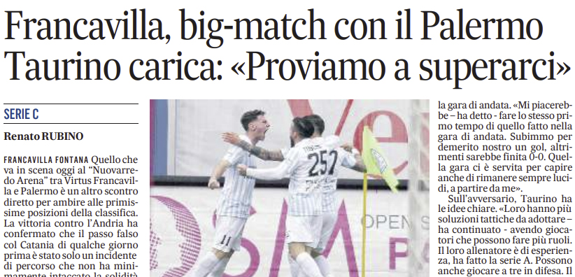 Quotidiano di Puglia: “Francavilla, big-match con il Palermo. Taurino carica: «Proviamo a superarci»”