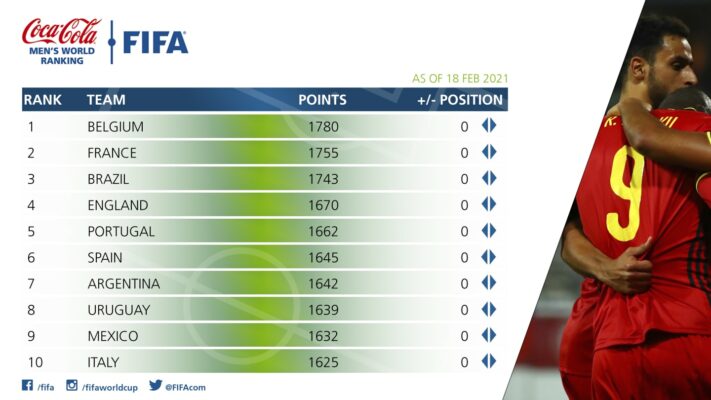 Il Ranking Fifa di febbraio 2021 non è cambiato più di tanto rispetto a dicembre 2020.