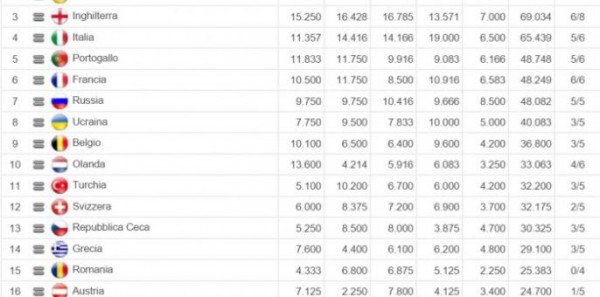 E’ stato aggiornato il Ranking Uefa per Nazioni: l’Italia è stabile al 4° posto con  65.439 punti, ancora sotto l’Inghilterra che però guadagna ulteriori punti sul nostro paese, ora sta a 69.034. Di seguito la Top10: