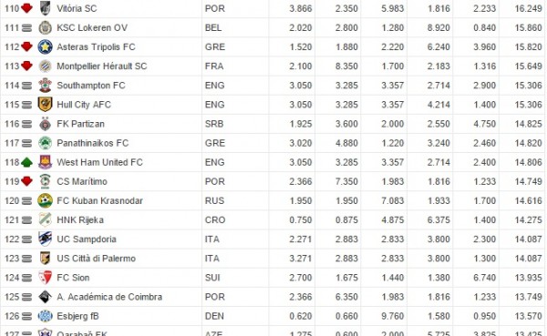 E’ stato aggionato anche il Ranking Uefa per club: una posizione in meno per il Palermo che dal 122° posto scende al 123 con 14.807 punti. Prima italiana in graduatoria è la Juventus che però scende di una posizione e si ritrova all’ottavo posto. Di seguito tutte le italiane in classifica: