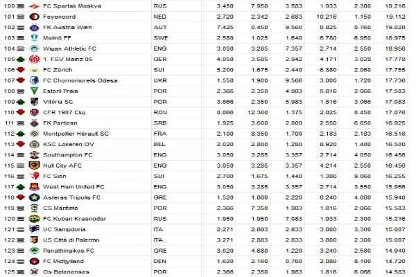 L’Uefa ha aggiornato il Ranking generale per le squadre di club. Il Palermo resta stabile al 123° posto. In Top 10 l’unica italiana presente, la Juventus scala di una posizione scendendo al nono posto, scavalcata dal Borussia. Di seguito le prime dieci posizioni: